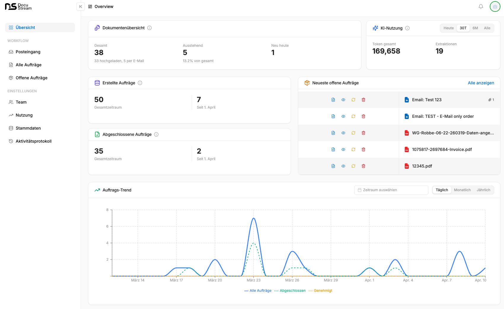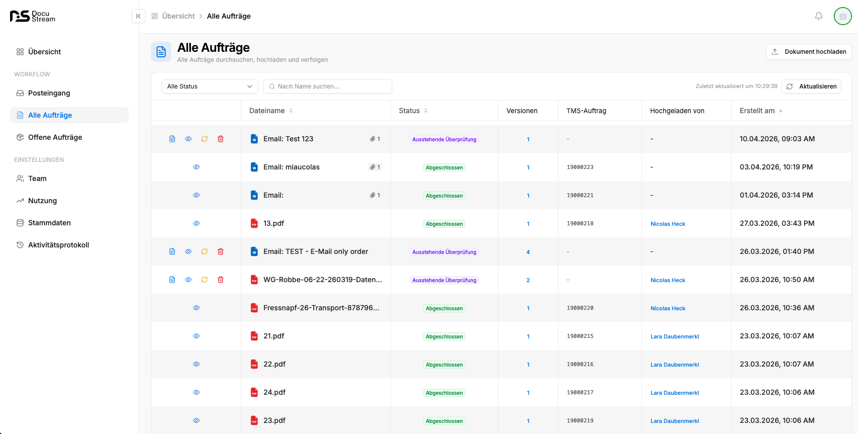 DocuStream liest E-Mails & PDFs aus und befüllt den Auftrag vor. Sie prüfen, klären markierte Felder und bestätigen alles im Dashboard. So sparen Disponenten Zeit, reduzieren Fehler und behalten jederzeit die Hoheit über alle Daten.